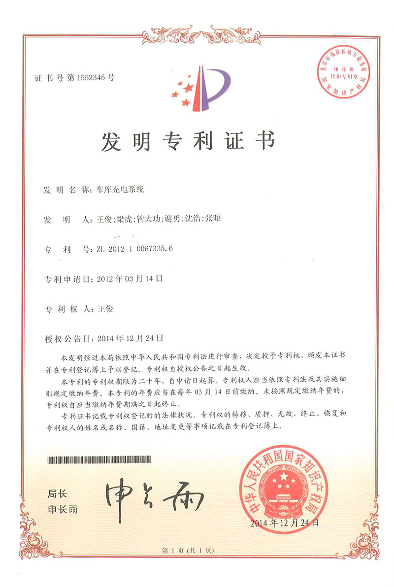 • 車(chē)庫(kù)充電系統(tǒng)-專(zhuān)利證書(shū)