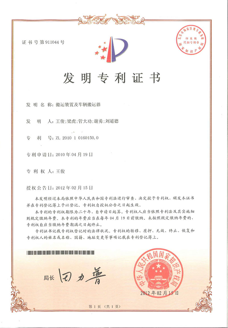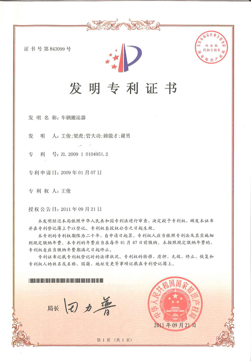 • 車(chē)輛搬運(yùn)器-專(zhuān)利證書(shū)