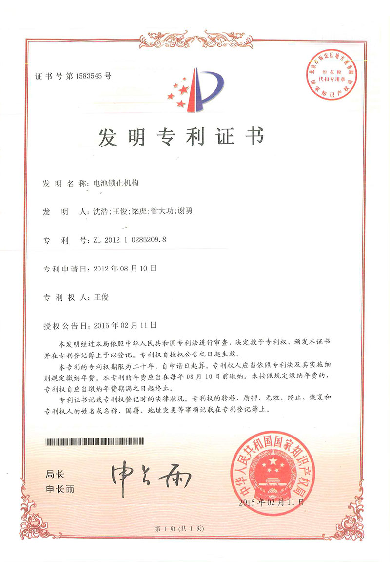 • 電池鎖止機(jī)構(gòu)-專(zhuān)利證書(shū)