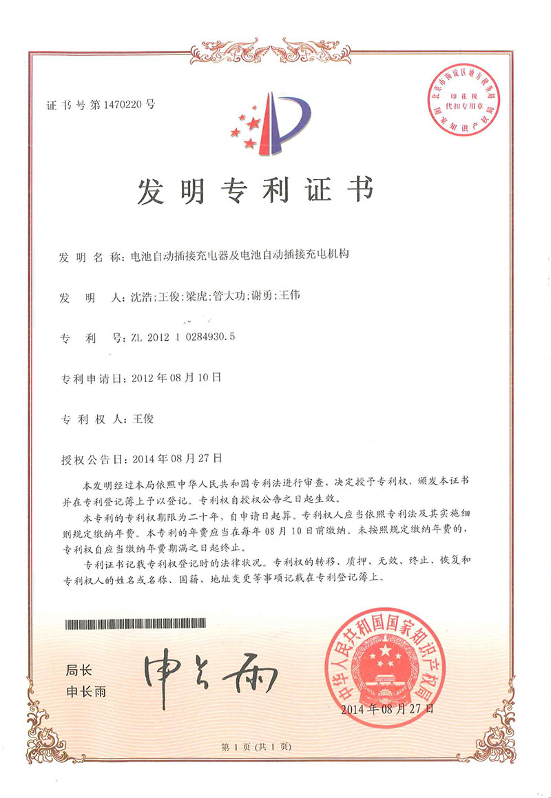 電池自動(dòng)插接充電器-發(fā)明證書(shū)